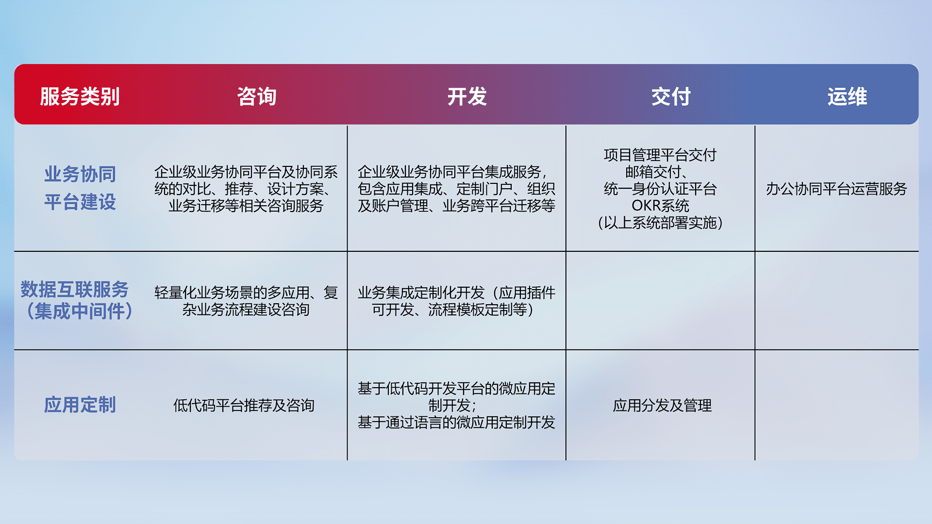 针对钉钉、、、企微、、、、IDaas等平台级产品提供产品的规划、、方案、、交付、、、、定制化开发等服务,,实现如统一协同办公、、、智能客户服务、、混合会议管理、、、智能数据查询、、等业务场景,,实现数字化转型。。。。